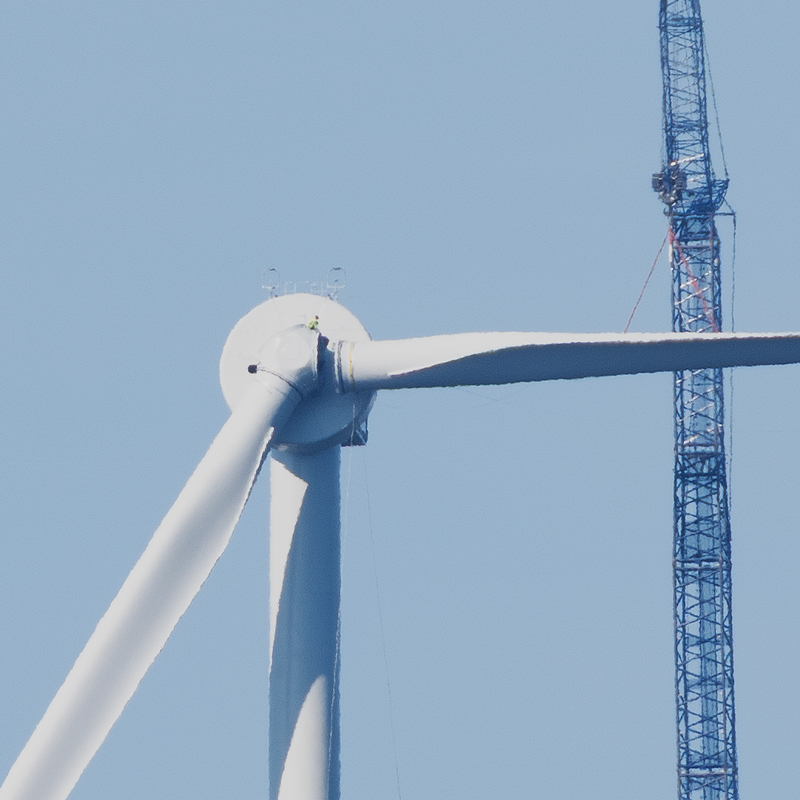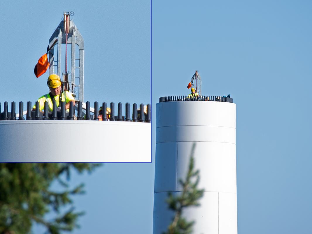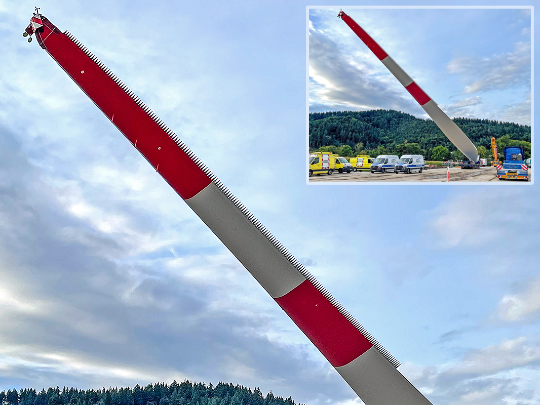 Im Vergleich zu den Rotorblättern der bisherigen, jetzt ersetzen Windräder aus dem Jahr 2023 fällt bei den neuen Rotorblättern im oberen Teil ihrer Hinterkante ein Absatz mit eng gesetzten Zähnen oder Spitzen auf (siehe die beiden Foto-Ausschnitte oben).