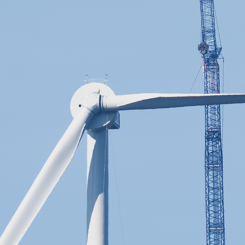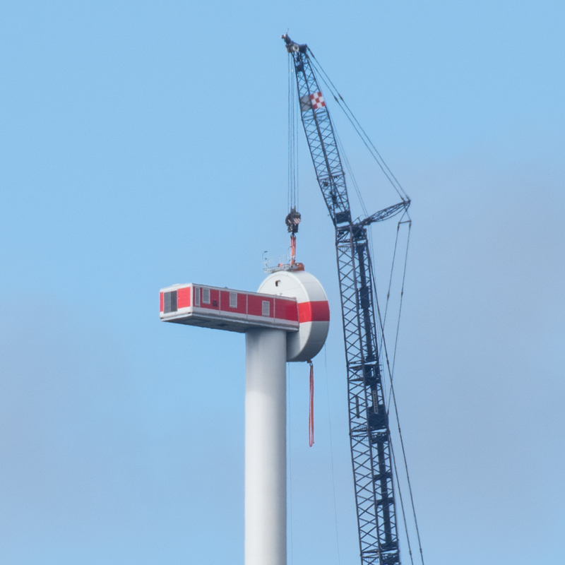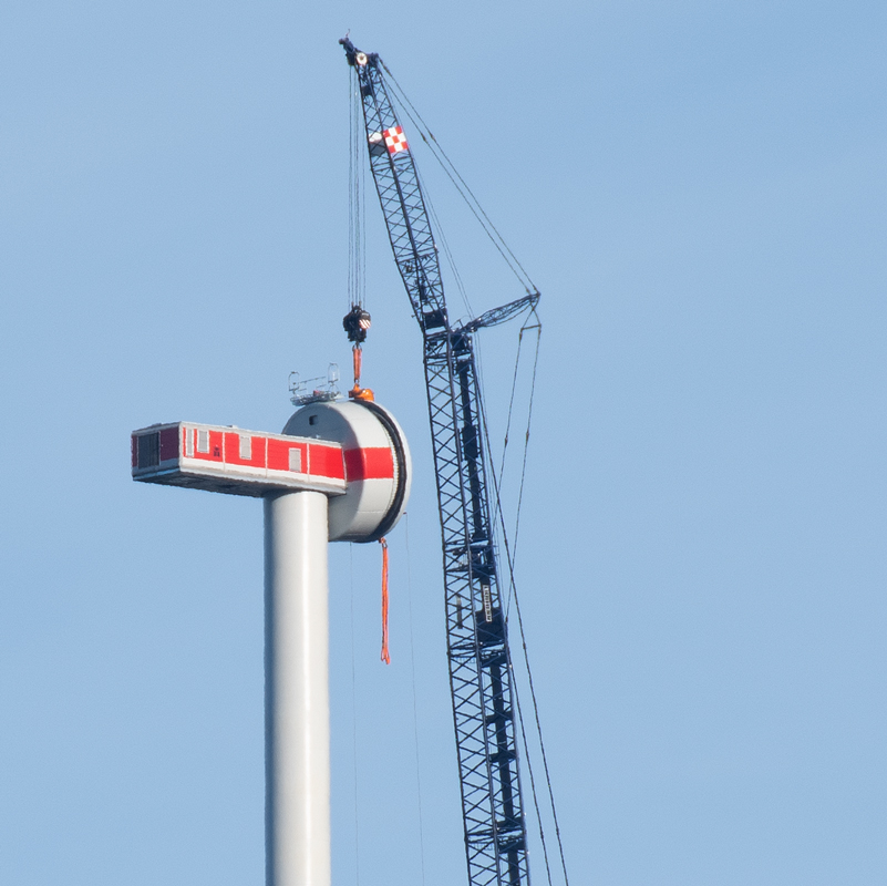 Die Gondel – das Maschinenhaus der Windenergie-Anlage – wird aufgebaut.