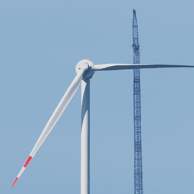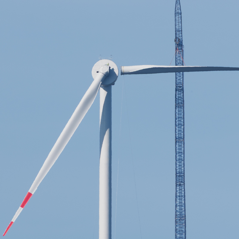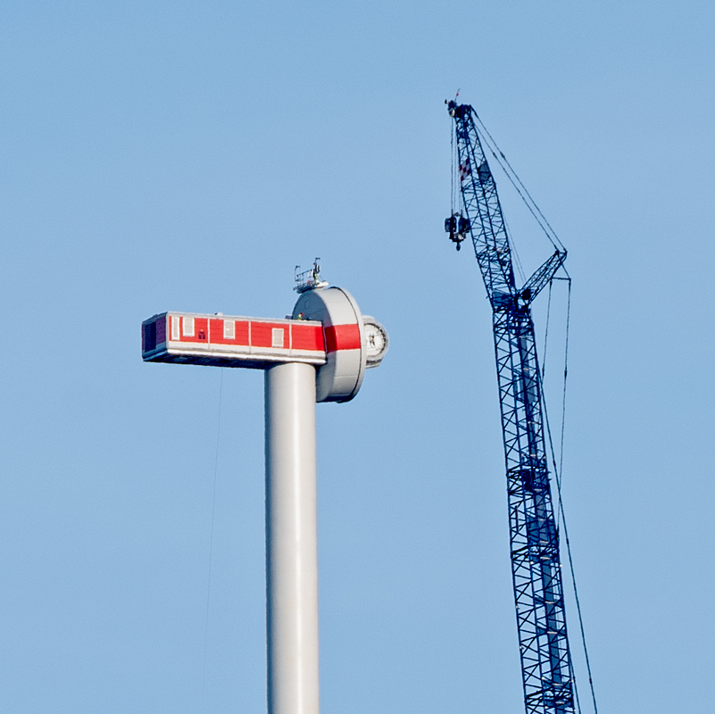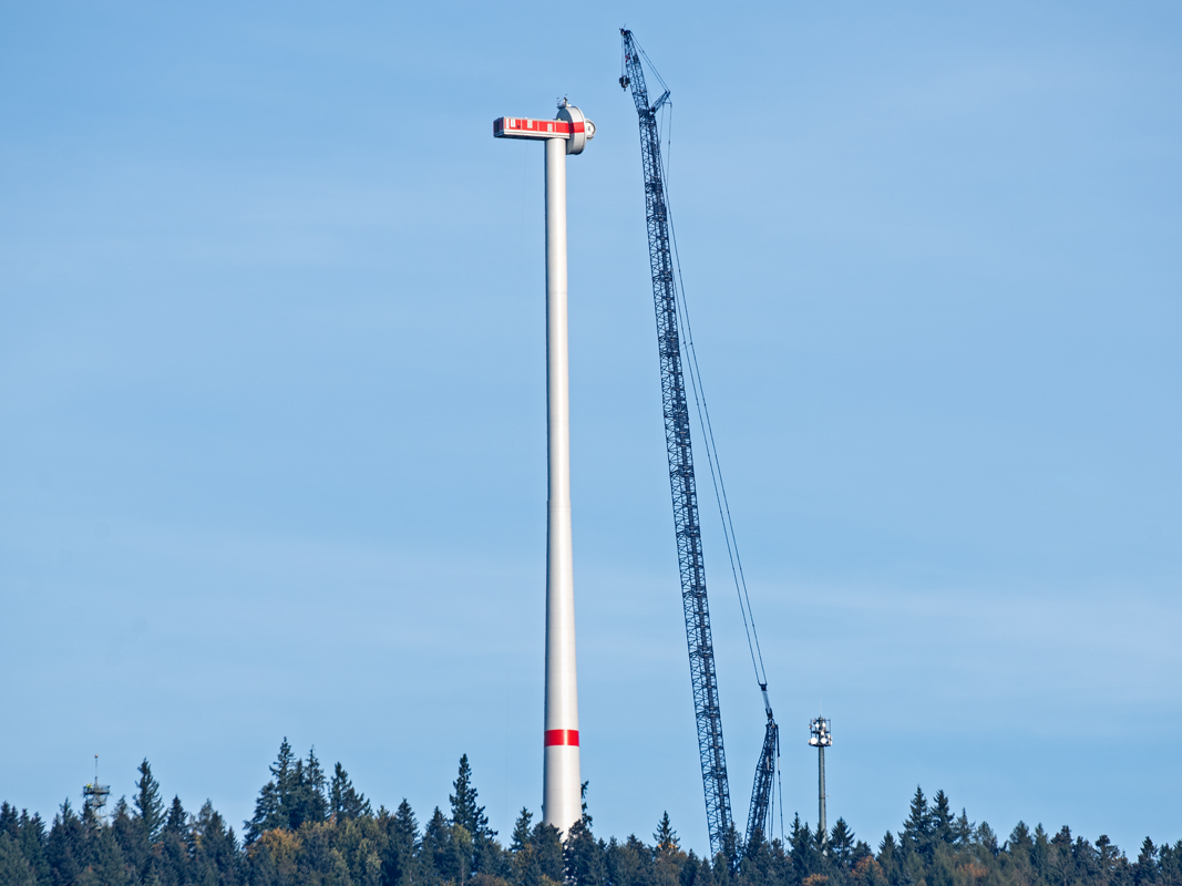 Aus der „Ferne“ ist die schrittweise Vervollständigung des neuen Windrads zu beobachten: Auf den Betonturm werden nacheinander die zylinderförmigen Stahlsektionen und schließlich die Gondel mit dem dreiflügelige Rotor aufgesetzt.