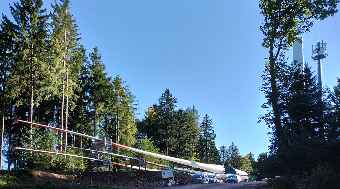 Die drei Rotorblätter für die Anlage WEA1 auf der Gemarkung Ebnet lagern neben dem Windradturm am Roßkopf, bereit mit der Nabe zu einem Windrad zusammengesetzt zu werden. Dieses hat dann einen Durchmesser von 138,25 m.