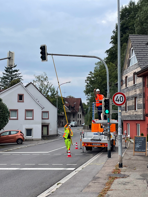 Da das Rotorblatt aufgerichtet auf dem Selbstfahrer transportiert wird, ist, unter anderem, das eng und niedrig stehenden Ampelpaar beim Fußgängerübergang vor dem Schlossgelände ein Hindernis für den Transport. Deswegen werden die Ampeln auf die Möglichkeit, sie zur Seite zu drehen, vorbereitet: Schrauben wurden gelockert und ein erster Test mit der Gabelstange vorgenommen. Im zweiten Foto sind diese Schrauben an der Manschette neben dem Monteur auf der Hubkanzel zu erkennen.