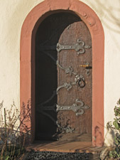 Der Haupteingang, ein rundbogiges Portal, befindet sich an der Westseite der Kapelle. Er ist werktags geschlossen, unter der Woche ist der kleinere Seiteneingang an der Südseite offen: Eine eisenbeschlagene Tür mit Rundbogen. Rechterhand über dieser Tür wurde 1965 ein romanisches Rundbogenfenster freigelegt.