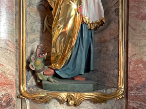 Die hl. Margareta (Margareta von Antiochia), die Schutzpatronin der Bauern, ist eine der 14 Nothelfer. Angerufen wird sie auch bei Schwangerschaft, Geburt und Unfruchtbarkeit. Sie hält ein Kreuz in ihrer rechten Hand und zertritt einen Drachen: Zwei Attribute durch welche die hl. Margareta in der Kunst häufig dargestellt wird. Diese Symbole gehen auf eine Legendenerzählung zurück: Im Gefängnis erschien Margareta ein riesiger Drache und drohte sie zu verschlingen. Sie schlug das Kreuzzeichen und rettet sich dadurch.