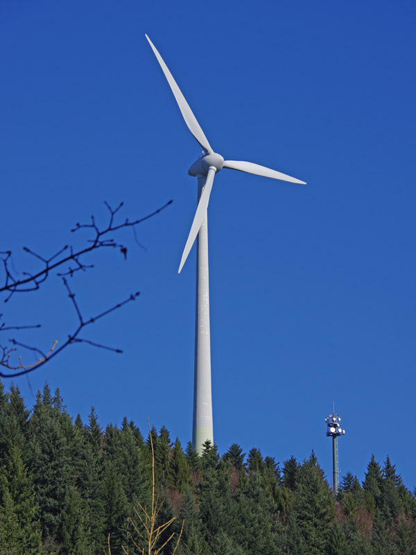 Kurz bevor man den Roßkopfsattel erreicht, steigt man nochmals aufwärts auf rund 600m und blickt hinunter auf den Sattel, der auf 587m liegt. Der kleine Höhenunterschied genügt, um bei entlaubten Bäumen einen Blick auf das Windrad und den Sendemast in der Nähe des Roßkopf-Gipfels zu haben. Den Weg hinunter liegt der Roßkopfsattel mit seiner breiten Wegkreuzung.