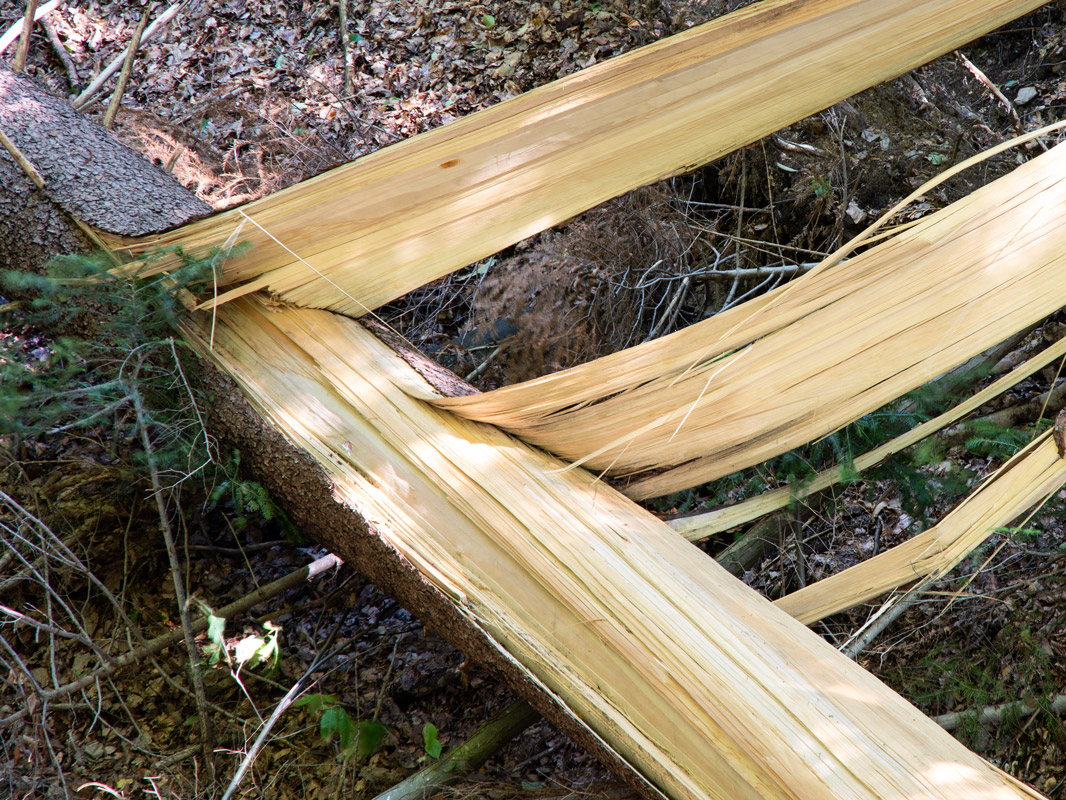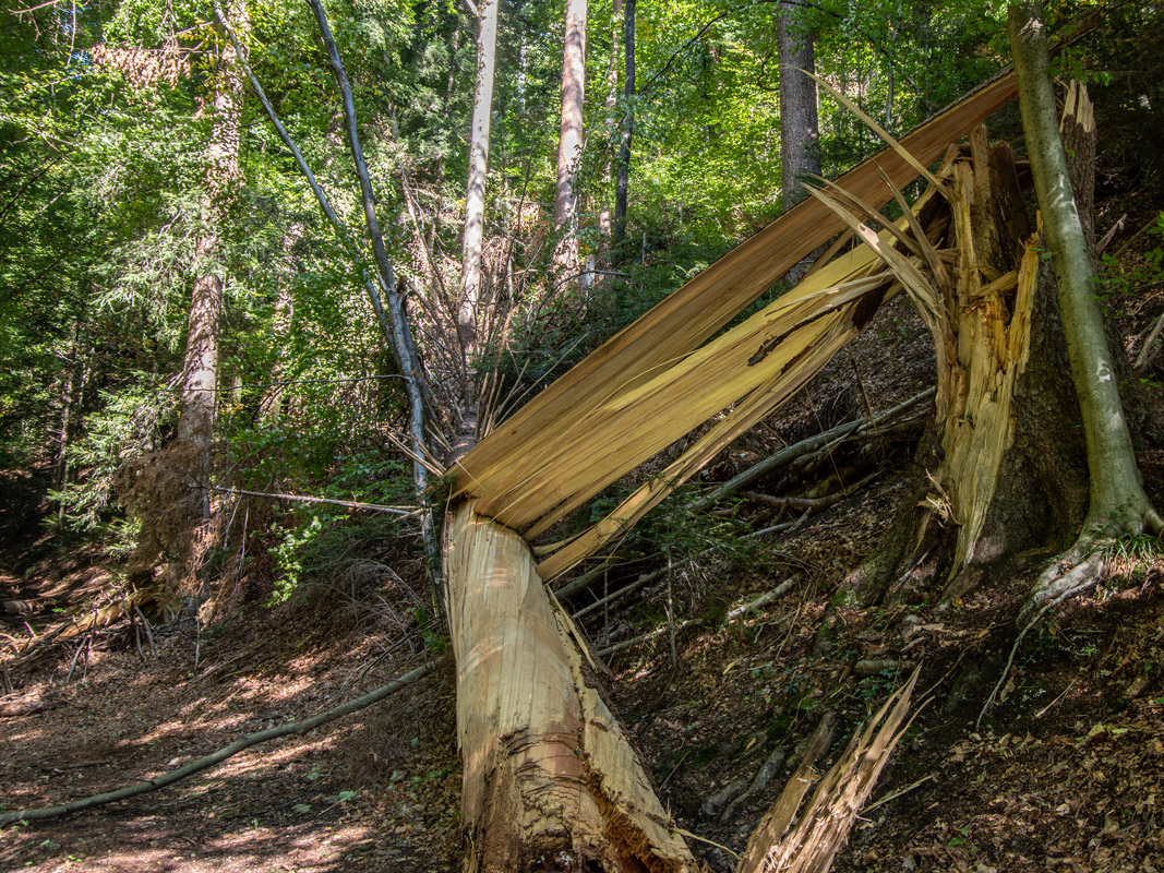 4. 10. 2022: Am Gegenhang zum Wanderpfad eine zusammengebrochene, hohe Fichte mit gesplittertem und teilweise entrindetem Stamm. Die Spitze des Baums liegt hangaufwärts langgestreckt zwischen Waldbäumen.