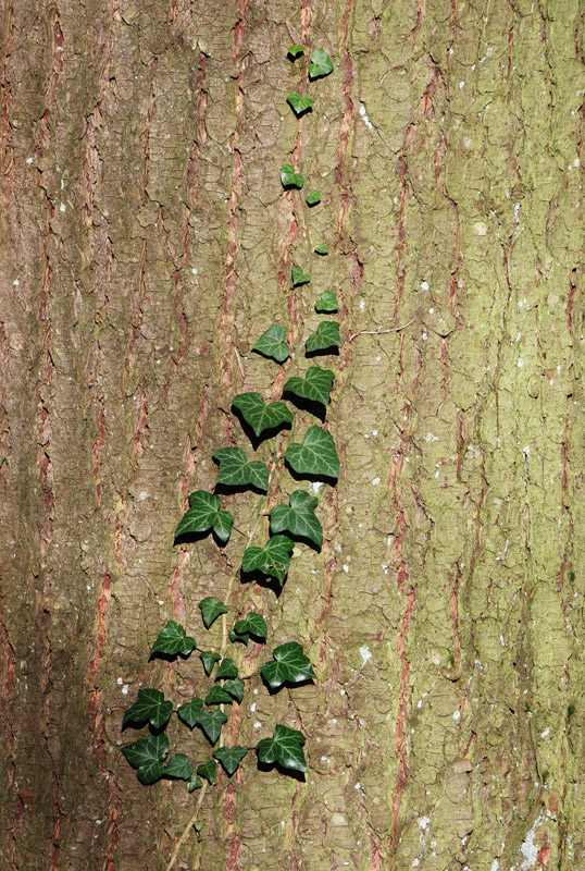 Auffällig das kräftige Grün der Efeu-Blätter an Baumstämmen. Der Efeu klettert die Stämme weit hinauf und wurzelt an ihnen.