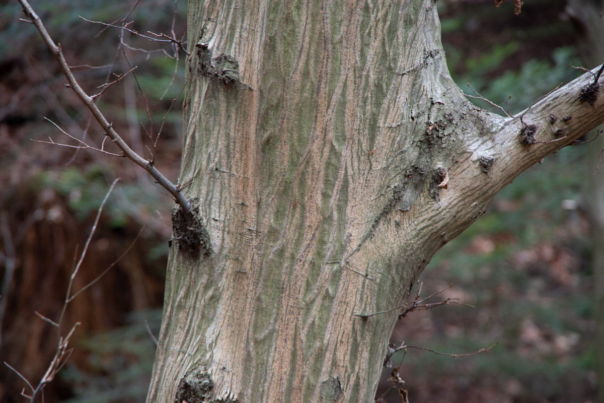 30. 12. 2020: Rechts am Rand des Pfads steht eine Hainbuche (Carpinus betulus) mit abwechslungsvoller, grün-rötlicher gezeichneter Rinde.