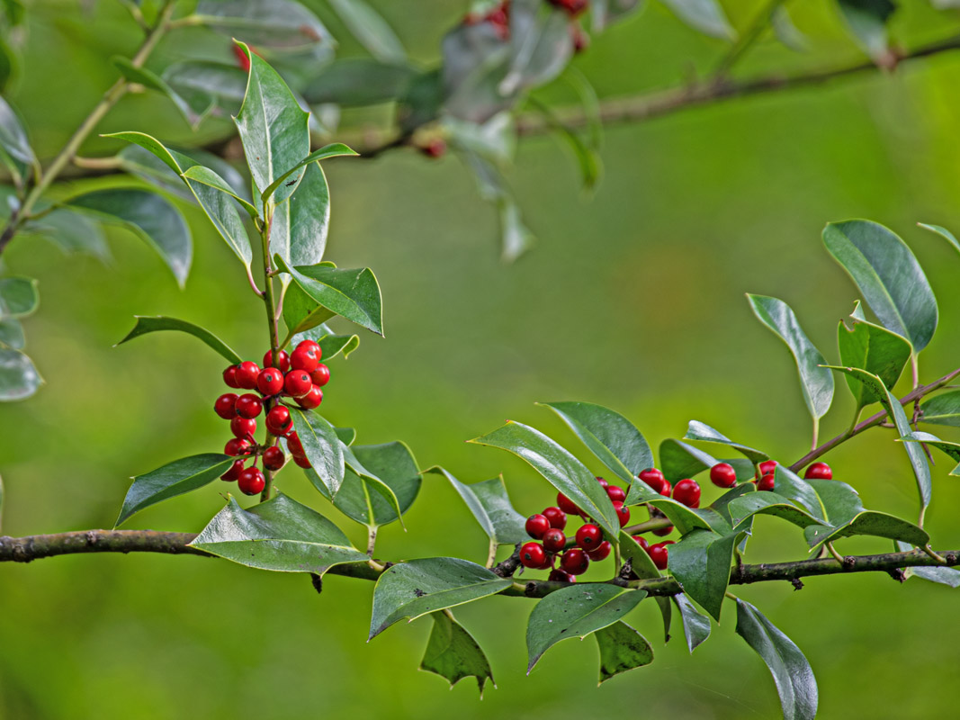 Ein Stechpalmen-Strauch mit roten Früchten am rechten Wegesrand