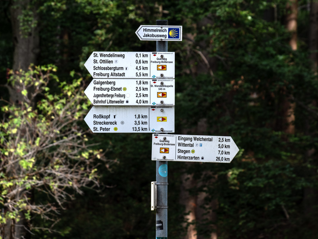 Gelbes Signet auf blauem Grund: Wander-strecke eines Jakobswegs – Abschnitt Himmelreich-Freiburg