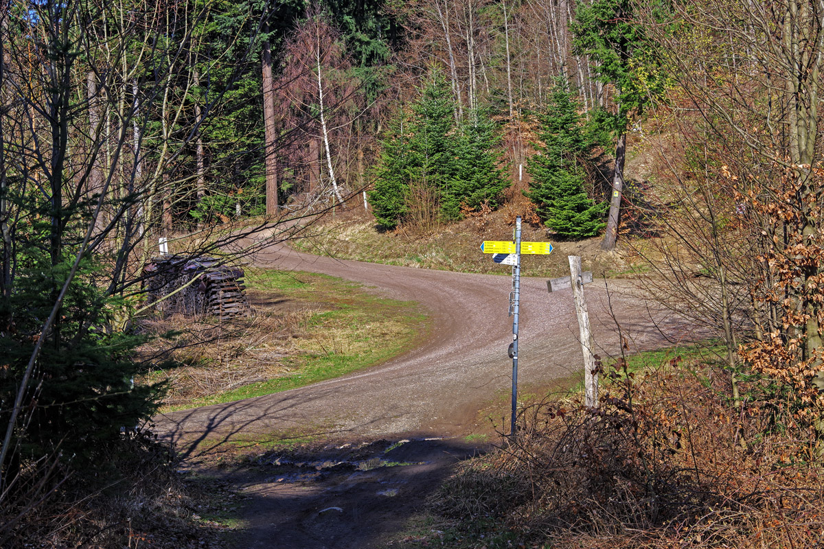 Auf dem Foto von 2018 sieht man direkt in der Weggabel einen verrotteten Baumstumpf. Er trug einmal ein Holzskulptur: "Hotzenplotz", geschaffen von Thomas Rees. Noch im März 2007 stand sie dort! Mehr zu Holzskultpur!