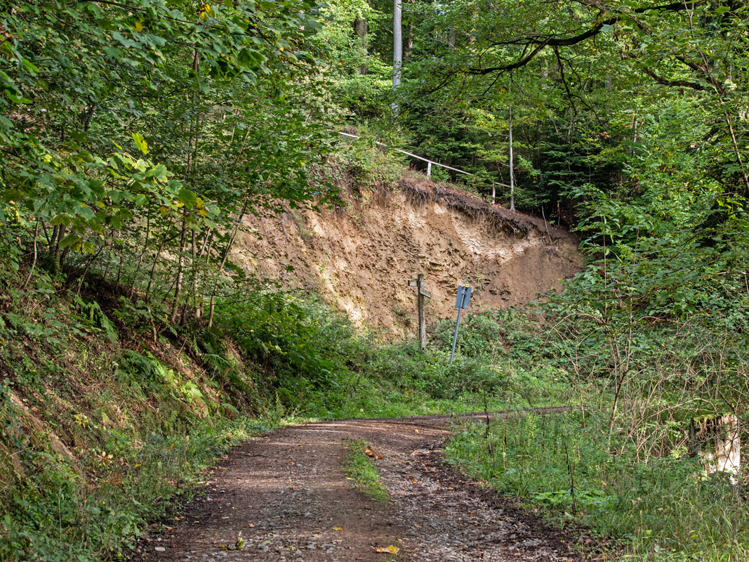 Bis hierher kann man auf geteertem Weg mit dem Fahrrad hinauffahren, es am Schutzgitter anschließen, um dann zu Fuß auf dem Pfad links vom (linken) Schild „absolutes Halteverbot“ in den Dobel hinein zu wandern.