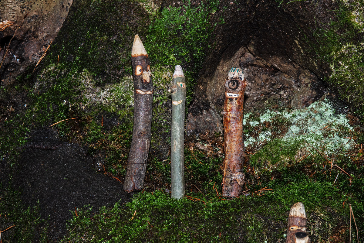 Überraschung zum Jahreswechsel 2021: Zahlreiche kleine Stockmännchen waren am Fuß von Baumstämmen, rechts des Pfades, aufgestellt und weiter den Pfad hinauf in Augenhöhe an Baumstämmen.