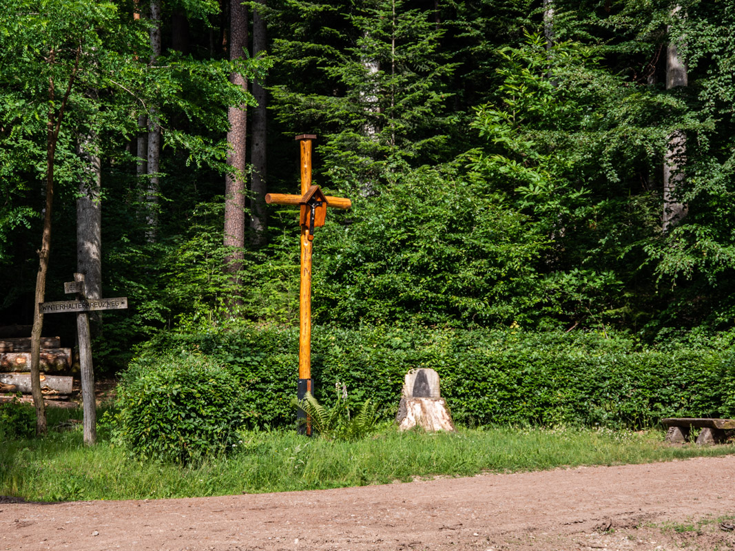 Der Wegweiser an der Abzweigung des Winterhalterkreuzweg vom Schieblerweg. / Das 2022 neu aufgestellte Winterhalterkreuz. / Blick den Winterhalterkreuzweg aufwärts: Hier hinauf geht die Wanderung weiter.