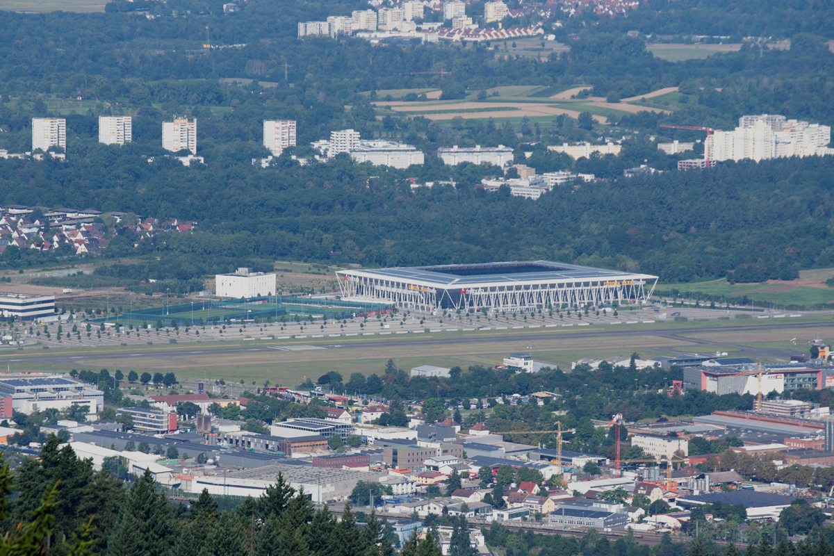 Foto links: Das Europa-Park-Stadion des SC-Freiburg, davor die Start-Landebahn des Freiburger Flugplatzes und das Brühl-Industriegebiet.