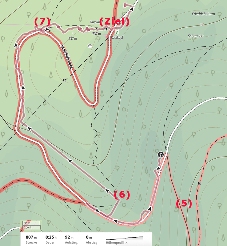 Der Aufstieg vom Wegpunkt (5) zum Wegpunkt (6) verläuft mit einigen Kehren. Zunächst steigt man auf der Ostflanke des Roßkopfs von Süden nach Norden bis zu einem breitem Querweg, dem Husarenweg, (siehe Karte rechts). Auf ihm folgt man in Nordsüd-Richtung, überquert die Borderline-Strecke, und biegt danach nach Nordwesten ab. Man trifft auf einen Pfad, dem man nach rechts in Ostrichtung folgt.