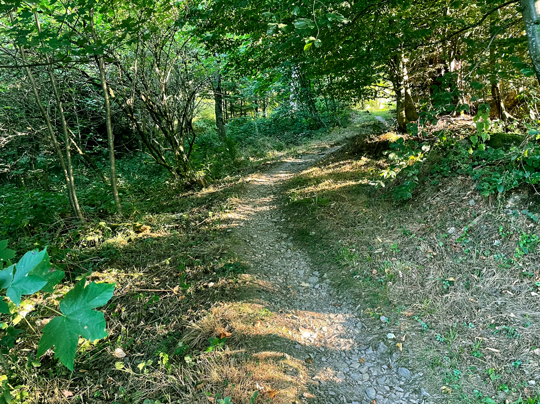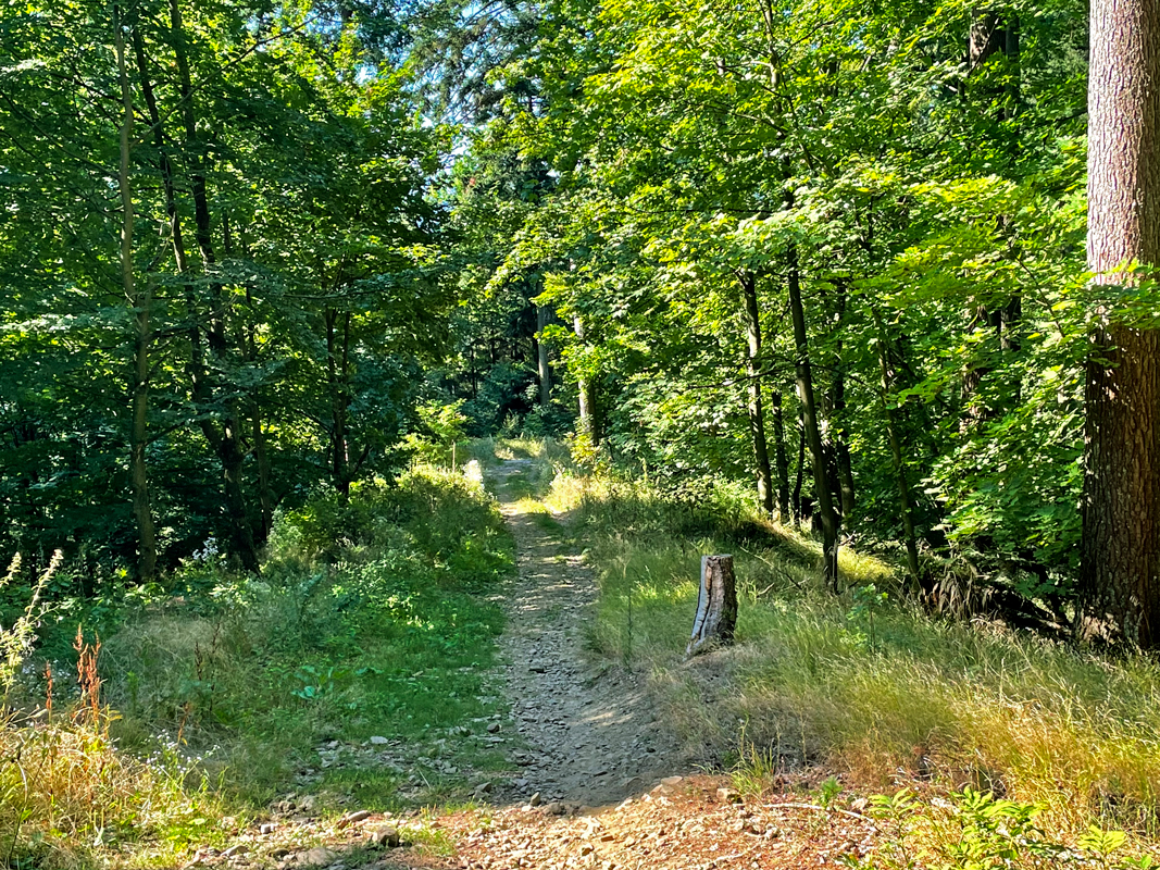 Nach dem Überqueren des Husarenwegs geht es etwas weniger steil abwärts, links und rechts stehen mehr Laubbäume und man merkt deutlich, dass man sich auf einem Kammweg befindet (Foto links).