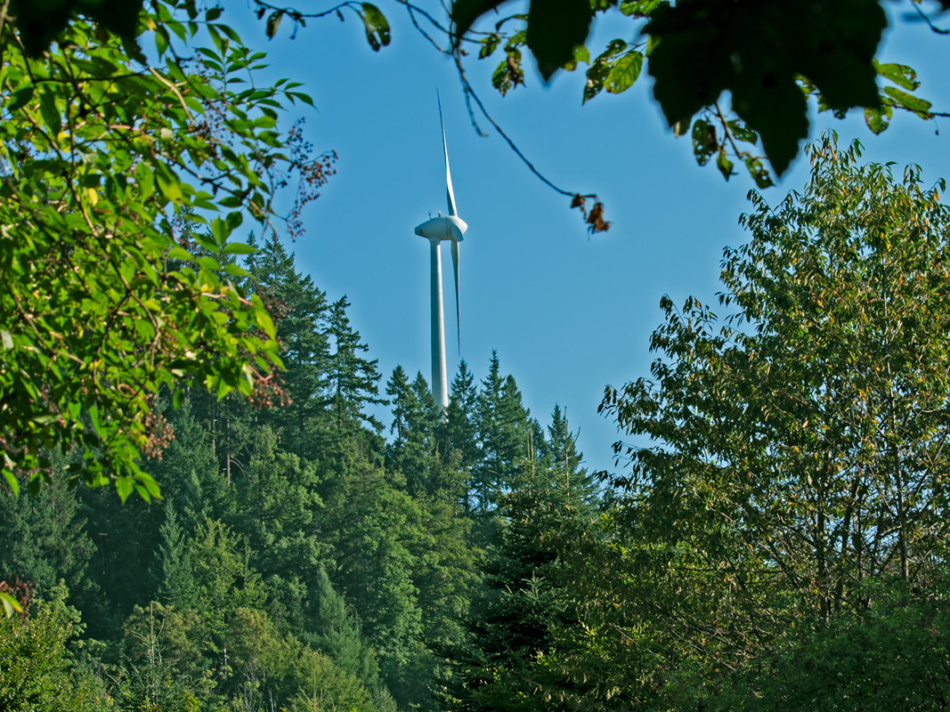 Den Roßkopfsattel kann man schon vom Waldpfad aus erahnen: Der Blick voraus fällt auf helleres Licht und schließlich entdeckt man zwischen den Baumwipfeln eine Windrad, Baujahr 2003.