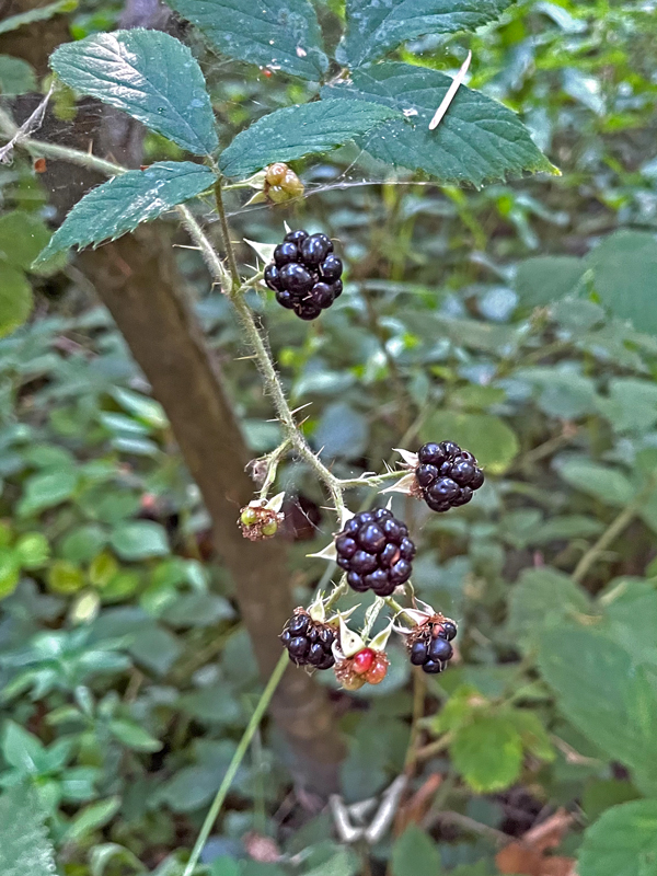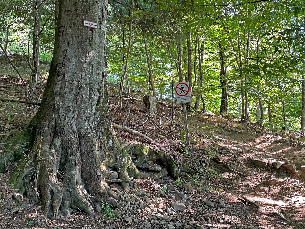 Brombeeren am Wegrand und glatte Felsplatten auf dem Weg. Tiefer unten fällt die Sonne auf den zu querenden, breiten Forstweg – es ist der auf dem Hinweg schon angesprochene Husarenweg. Links davor erkennt man den schmalen Pfad, auf dem man beim Hinweg kam, um auf den Roßkopf zu steigen.