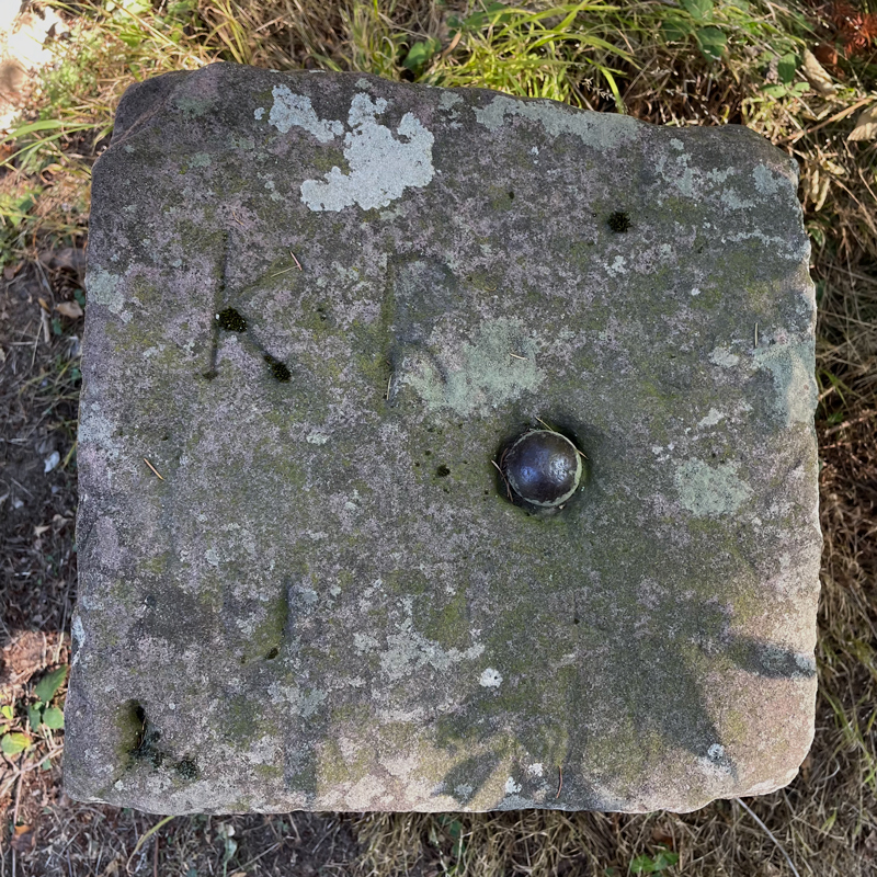Der Pfad auf dem Kammrücken führt wieder zurück auf den breiten Roßkopfhaldenweg. Kurz darauf sieht man linkerhand einen hohen, dunklen Stein. Auf seinem Kopf ist eine Metallkugel eingelassen. Auf einer Seite ist ein großes „S“ eingraviert und darunter in Großbuchstaben „OTTILIEN“. Diese Seite zeigt den Pfad an, der zur Wallfahrtskapelle führt. Man verlässt damit den Kammrücken und steigt nach seiner Ostseite hin ab.