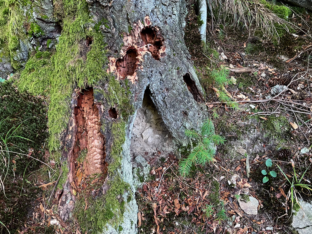 Foto links: alter Baumstumpf, benagt und durchlöchert von Tieren, vermutlich von Spechten.
