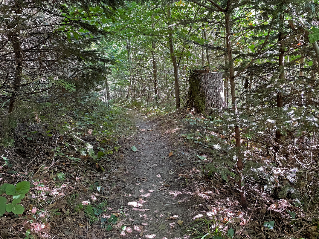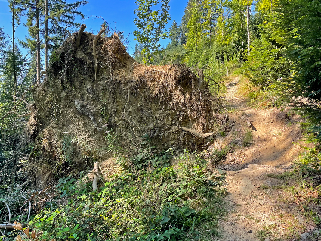 Der Hangweg wird schließlich fast baumfrei und sonnig: Er quert eine breite Waldschneise, geschaffen wohl durch Windbruch. Davon zeugt eine „Wurzelwand“, die man beim Blick den Weg zurück in ihrer Masse wahrnimmt.