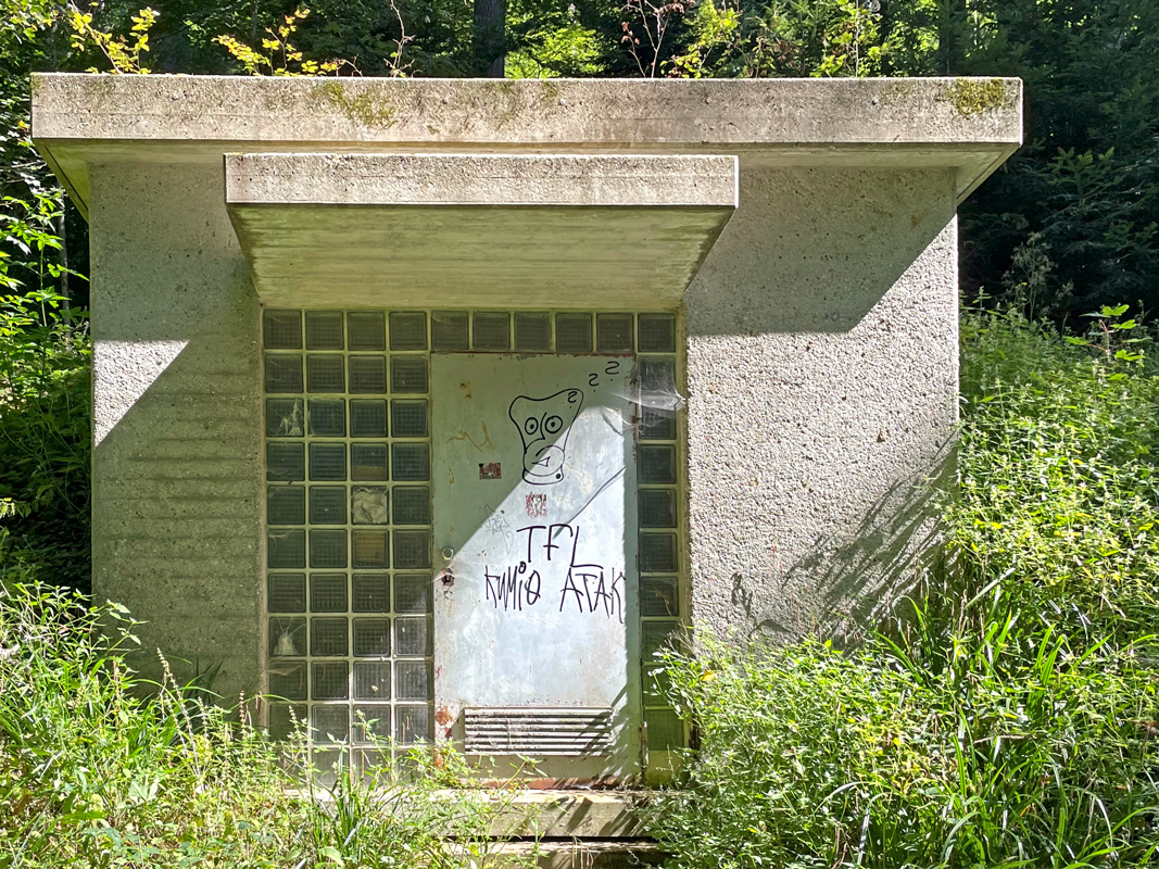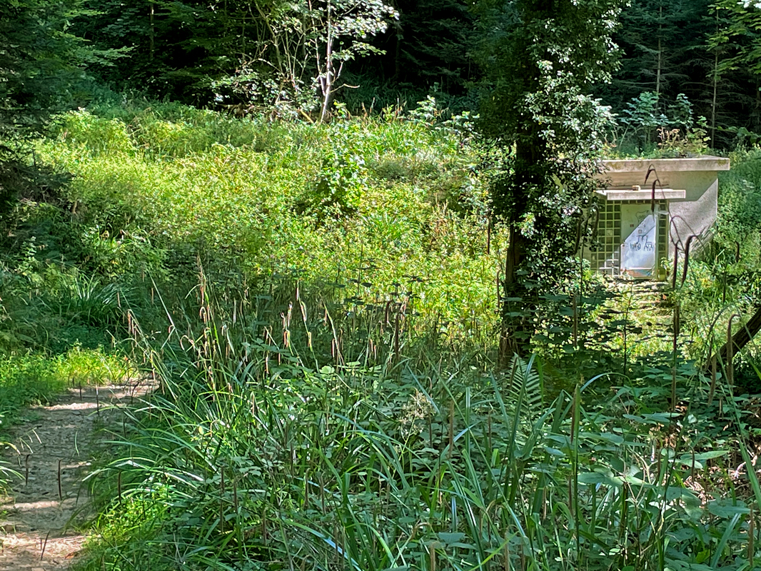 In der Mitte der Kehre steht links am Hang ein Wasserschloss. Es nimmt das Wasser der Quellen auf – in der Karte sind es zwei, die am Ende des St.-Ottilien-Dobels über dem Wasserschloss austreten.