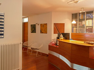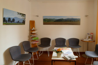 Blicke ins Wartezimmer (Fotos links) und in den Empfangsbereich (Fotos unten)
