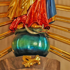 Im Kircheninneren zeigt das rechte Mosaik auf der Altarraum-Rückwand eine Darstellung der hl. Barbara mit Turm, Kelch und Hostie. Siehe Foto rechts oben.
