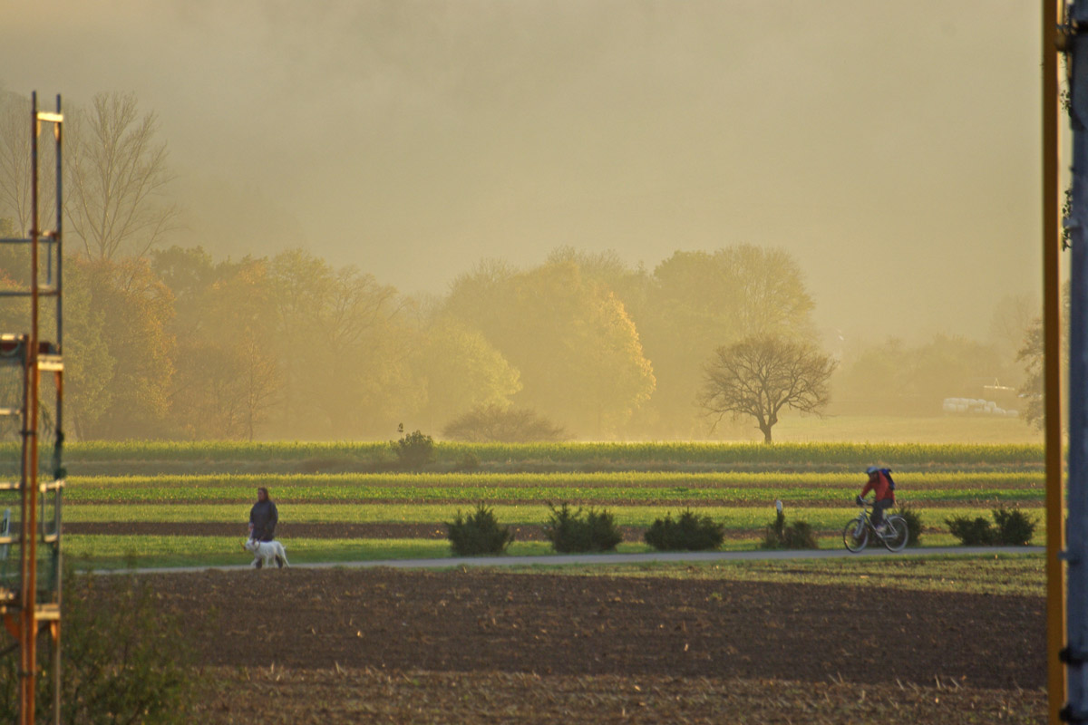 Morgennebel am 16. April 2018 um 7:38 Uhr; links im Hintergrund erkennt man das Dach eines Autos der Badenova vor dem Gelände des "Hungerbrunnen 2"