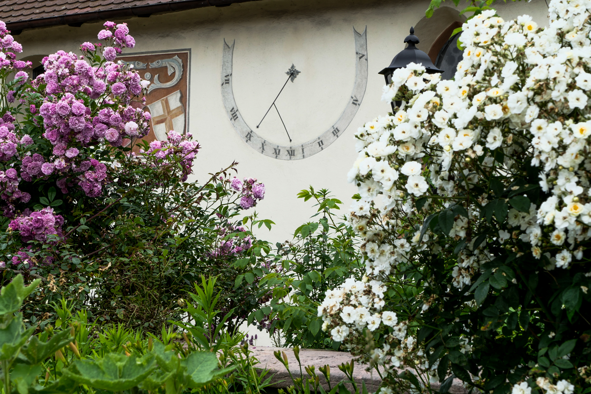 Rosenstöcke im St. Johannesgarten in Zarten, Blick auf die Südseite der St. Johanneskapelle mit Sonnenuhr und Wappen