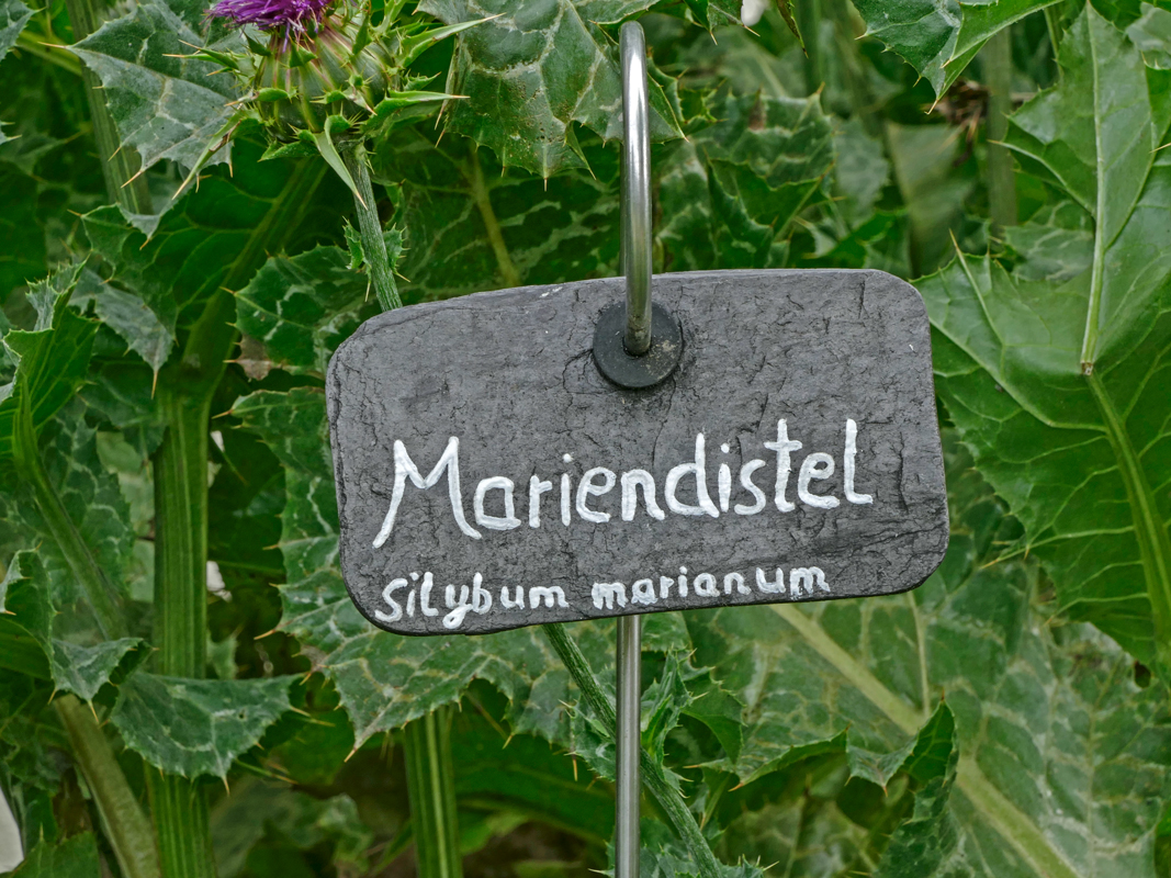 Mariendistel (Silybum marianum), Heilpflanze, wird für medizinische Zwecke auch auf Feldern angebaut.
