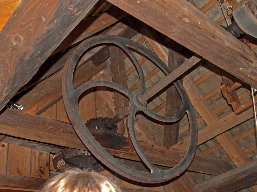Achse des Stockrads weitergibt. Auf beiden Fotos das hölzerne Kammrad, das die Drehbewegung für das