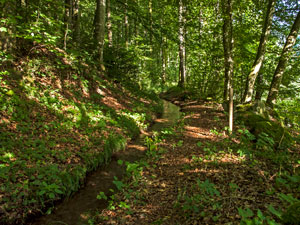 Foto rechts:Ruhiger, gleichmäßiger Wasserverlauf entlang des Waldrands, gesehen gegen die Fließrichtung.