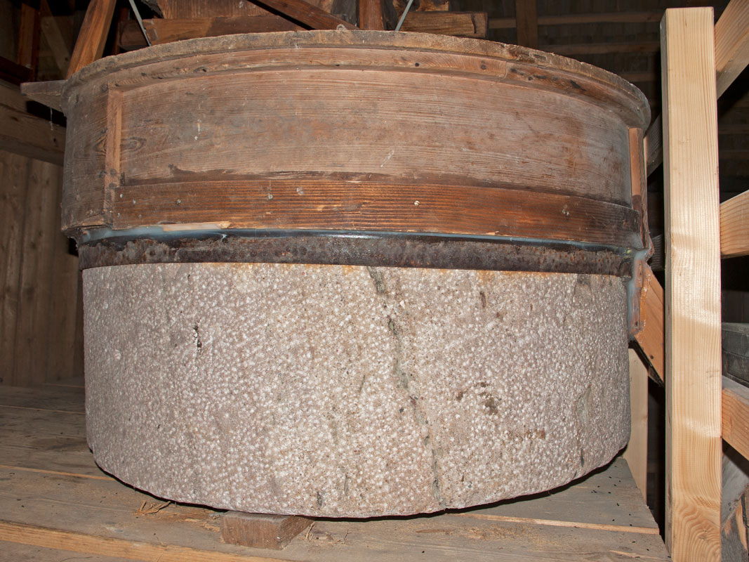 Der Läuferstein befindet sich versteckt in einer hölzernen, kreisförmigen Zargen. In ihr wird die Kleie und das Mehl gesammelt und über das Mehlrohr in den darunterstehenden Mehlkasten geleitet.