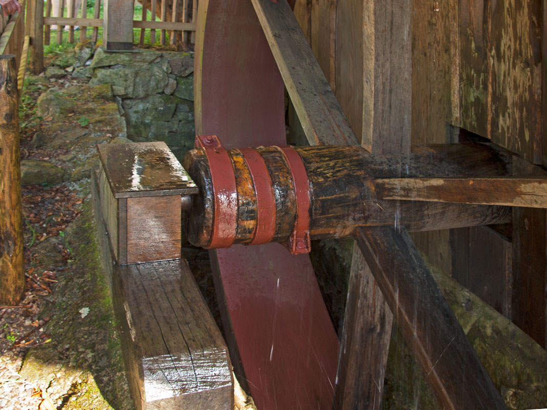 Foto links:Achse des Wasserrads (Wellbaum): Sie bewegt sich seit der Sanierung reibungsarm in einem Kugellager.