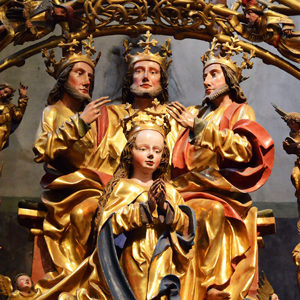 Mariä-Krönungsaltar von 1489 in der Basilika Seckau / Steiermark / Österreich mit einer Darstellung der Dreifaltigkeit als Figur mit drei Köpfen und zwei Armen. Diese Darstellung wurde später verboten. Der Altar ist denkmalgeschützt.