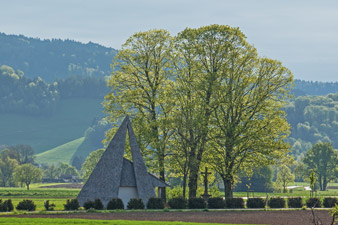 Besonders von Osten aus ist das Ensemble aus Kapelle und Kreuz mit mehreren Bänken, umfasst von den ausladenden Linden, in seiner einladenden Geste wahrzunehmen: ein Ort zum Ausruhen und Innehalten.