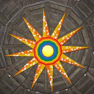 Einen Traum habe auch ich mit euch zusammen verwirklichen können. Hier in unserer Auferstehungskirche ist mir lange schon die besondere Gestaltung der grauen Betondecke aufgefallen. Oben in der Mitte laufen die Rippen zusammen wie die Strahlen einer Sonne. Lange schon hatte ich daran gedacht, diese Mitte einmal zum Leuchten zu bringen. Mit dem großen, von euch gestalteten Stern ist heute dieser Traum erfüllt.