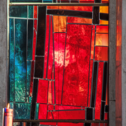 Foto rechts: die Nahaufnahme eines Fensterausschnitts, um die gelöteten Glasfassungen zu zeigen.