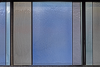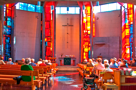 Die hohen, abstrakt gestalteten, farbigen Fenster symbolisieren den Weg von der Passion zur Auferstehung. Vom Eingangsportal beginnend in dunklerem Blau-Grau bis zum