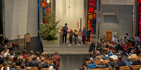 Foto links: Der Familiengottesdienst an Heiligabend, 2024, mit einem Krippenspie. Am Altar vier Hirten, Maria und Josef und vor ihnen "das Kind" in einem Korb.