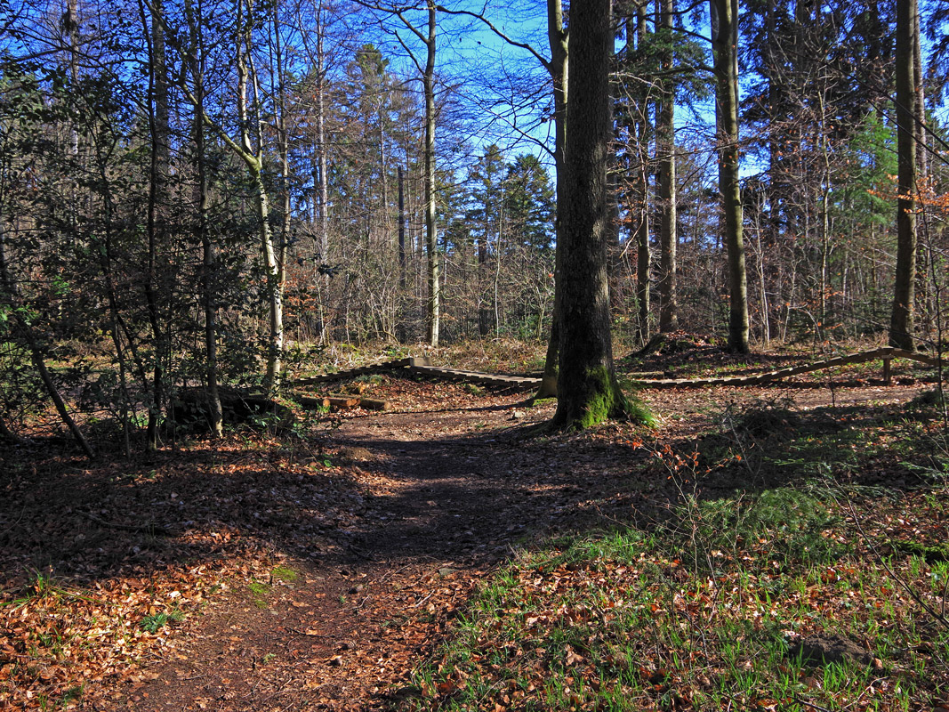 Immer mal wieder öffnet sich der Blick linkerhand zum Himmel über dem Bergkamm. Dieser verläuft vom Roßkopf hinunter nach Ebnet und ist vom Winterhalter-kreuzweg nicht weit entfernt unf verläuft nur etwa 50m über ihm.