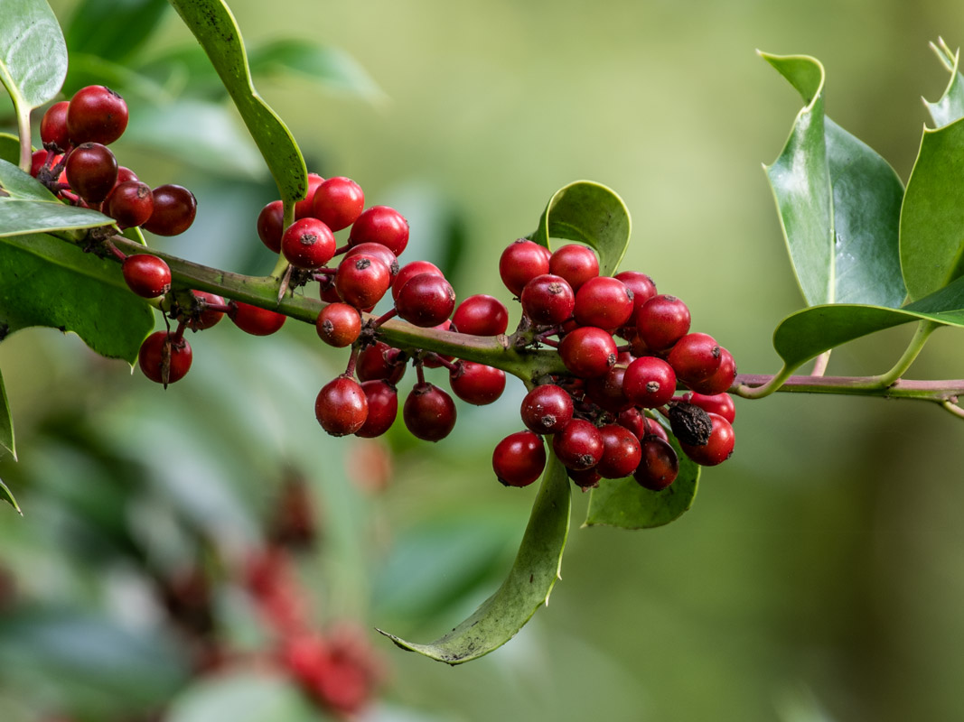 Ein Stechpalmen-Strauch mit roten Früchten am rechten Wegesrand