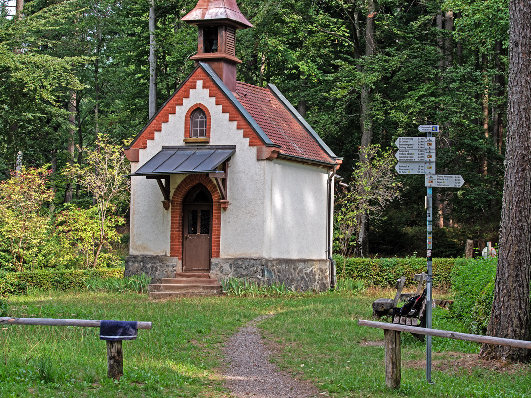Blick vom St. Wendelinweg auf die Kapelle und den Wegweiser vor dem Kapellengelände. Der Eingang der Kapelle liegt auf ihrer Südseite.