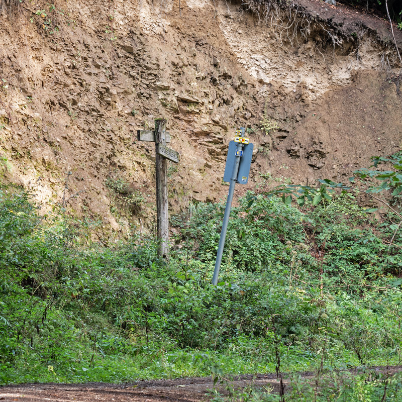 Auf dem Foto von 2018 sieht man direkt in der Weggabel einen verrotteten Baumstumpf. Er trug einmal ein Holzskulptur: "Hotzenplotz", geschaffen von Thomas Rees. Noch im März 2007 stand sie dort! Mehr zu Holzskultpur!