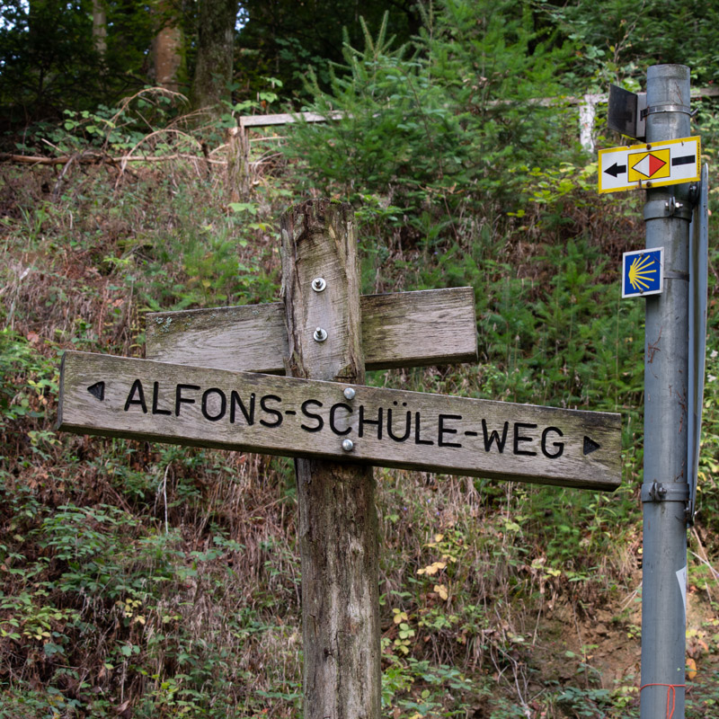 Der Alfons-Schüle-Weg führt unterhalb des Hangabbruchs rechts weiter ins hintere Welchenbachtal. Nach links biegt steil ansteigend der St. Wendelinweg ab, auf dem auch der Pilgerweg weiterführt.