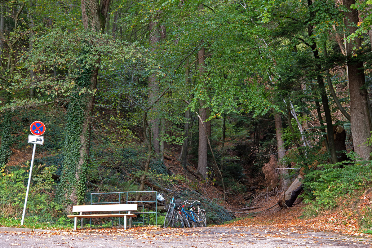 Bis hierher kann man auf geteertem Weg mit dem Fahrrad hinauffahren, es am Schutzgitter anschließen, um dann zu Fuß auf dem Pfad links vom (linken) Schild „absolutes Halteverbot“ in den Dobel hinein zu wandern.