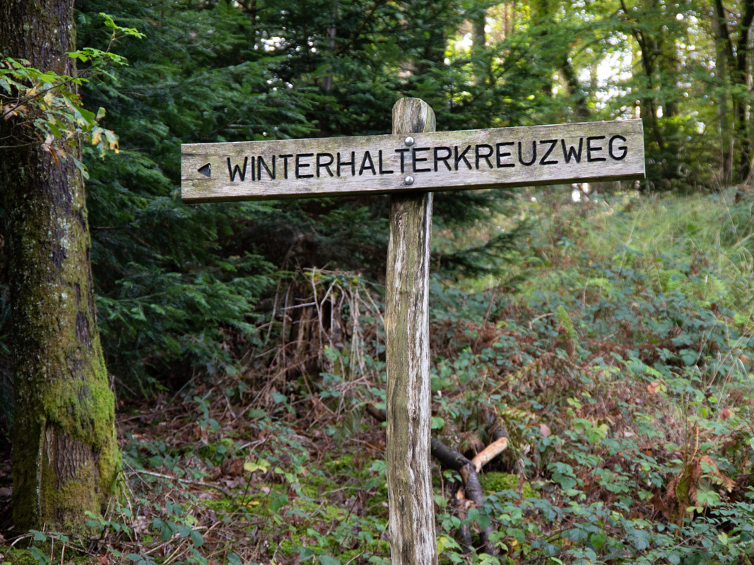 Der Wegweiser an der Abzweigung des Winterhalterkreuzweg vom Schieblerweg. / Das 2022 neu aufgestellte Winterhalterkreuz. / Blick den Winterhalterkreuzweg aufwärts: Hier hinauf geht die Wanderung weiter.