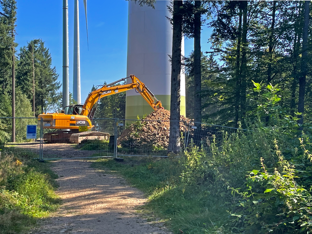 Direkt hinter dem Friedrichsturm (Roßkopfturm) führt ein Weg zur Baustelle der neuen Windenergie-Anlage, Gemarkung Ebnet.