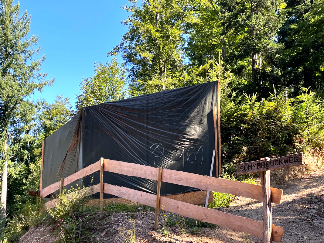 Auf der Karte ist eine Hütte eingezeichnet – die Schutzhütte „Obere Roßkopfstufe“ (Foto rechts). Am Wandertag war sie „eingepackt“ – vielleicht auch eine Maßnahme im Zuge der Transporte zum neuen Windrad? An dieser Stelle zweigt der Sonnenbuckweg ab, eine Verbindung zum Rosskopfweg. Er ist es schließlich, der zu den Baustellen der Windräder führt.
